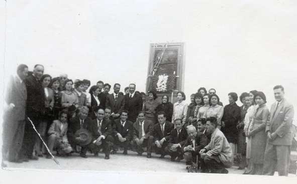 Parados de izquierda a derecha: Gustavo Ramírez, Santos Burga León, Mercedes Malea de Linares, Oiga, Sara y Aurora Yepez Ortiz, Jacob Novoa Malea, Zoila Contreras de Quiroz, "Amaranto", Telmo Quiroz Castañeda, Arístides Ortega Cruzado (Alcalde de San Miguel) Raquel Novoa Vda. de Farro, María Luisa Rojas de Quiroz, Aurelia Quiroz Rojas, Teresa Mallqui, Ina y Humberto Arias Cubas, Lucha Barrantes de Chico, Rosa y Rosario Vásquez Torres ,Marina Quiroz Rojas, Esther y Orfelia Díaz y Lorenzo Quiroz