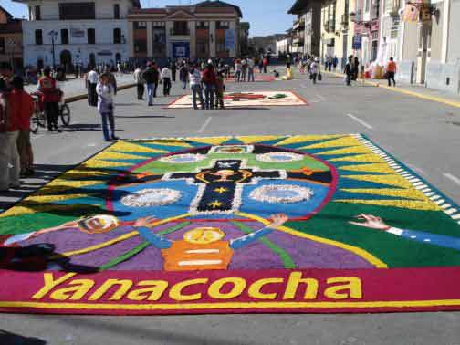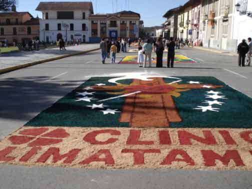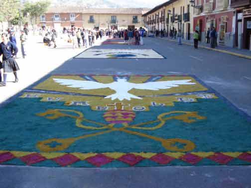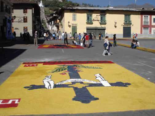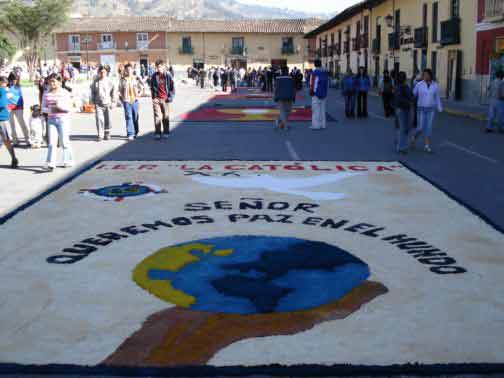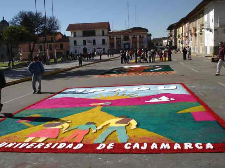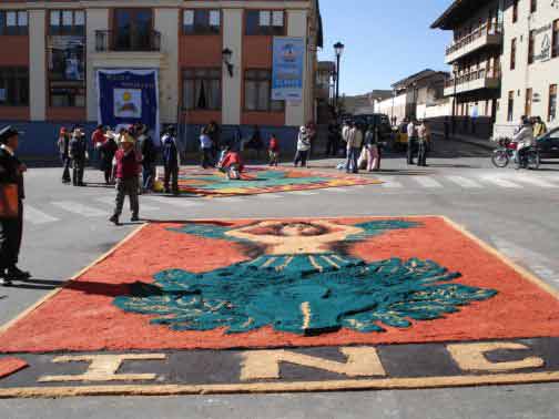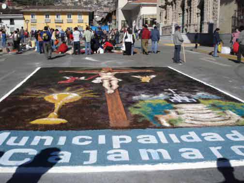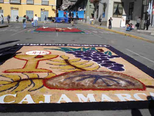 Les presentamos las fotografías de algunas alfombras que se erigieron en el perímetro de la Plaza de Armas de Cajamarca, por algunas instituciones, rindiendo un justo homenaje al Cuerpo de Cristo, fueron tomadas a las 08:00 a.m. el día central de la fiesta de Corpus Christi, 07 de junio del 2007, antes de la procesión. Cada alfombra lleva su nombre o el logo de la institución que la confeccionó, fueron maravillosas, con motivos religiosos majestuosos, verdaderas obras de arte. Cajamarca, 12 de junio del 2007. |