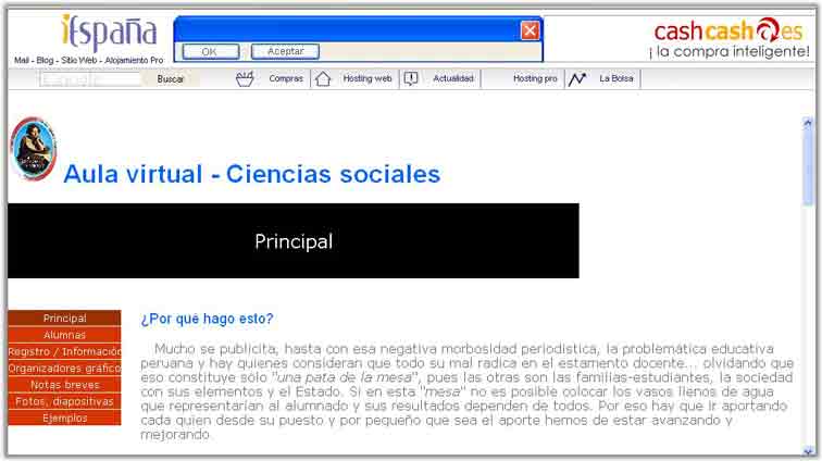 Se ha puesto en la World Wide Web la flamante página educativa "Aula virtual - Ciencias Sociales" que ha sido desarrollada en forma magnífica por Prof. y escritor cajamarquino Guillermo Bazán Becerra, esto constituye un gran despegue en el campo educativo peruano y un gran ejemplo que, obligatoriamente, tienen que seguir los buenos maestros abnegados y dedicados como lo es Guillermo, solamente lamentamos que no se aplica en ninguna Institución Educativa cajamarquina como es nuestro natural deseo, sino en el Colegio trujillano "María Negrón Ugarte".