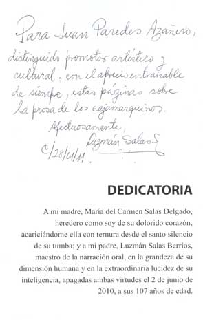 AGREGADO EN LAS SONRISAS DE LOS RECUERDOS DE El primer territorio libre de América -ha dicho Manuel Scorza- es el de la Literatura, acaso porque sólo a través de ella los sueños son posibles. Ser ciudadano de esta nación y territorio, por tanto, es una oportunidad insoslayable de ejercer el derecho de expresión con mayor albedrío. Ese es el don de la Literatura que busca ejercer todo creador de esta manifestación artística y que el autor de este libro ha hecho personalmente suyo. Estos diez relatos que recorren -según el autor- por las sonrisas de sus recuerdos, nos recrean sus años juveniles de antaño, como estudiante y hogaño, como docente en el nivel secundario. Por su temática, este conjunto de relatos demuestran la vivencia de los jóvenes que, por razones de estudios, emigran del hogar paterno a sobrevivir en la gran ciudad y allí, si no tienen la madurez y el criterio necesarios, o perecen en la cotidianeidad y la rutina u, ordenando su vivir, construyen su porvenir con seriedad. Aquellos que no han recorrido esa odisea, la experimentan en su propio entorno familiar y social, el mismo que no deja de tener su propio libro de experiencias memorables. Los títulos de cada uno de estos cuentos y su desarrollo confirman nuestra opinión: “El amor fuera del aula” que relata una excursión escolar y los desatinos de los adolescentes; “Los chiquillos de la quinta”, “La hermanitas Lobato” y “El infortunado amante” que confiesa las travesuras experimentales en los escarceos amorosos que no sólo pintan de rosado las páginas en blanco, sino que ahí la vida garabatea los fracasos iniciales. Casi lo mismo ocurre en “Siete noches de abstinencia” aunque el contexto es la vida universitaria. Es a partir de “Un encuentro inesperado”, “La gran faena”, “No me cojas el arma”, “El turista Purisaca” y “Las travesuras de Diógenes”, que los escenarios amplían su radio de acción y su temática trata de ser más social, ya que los hechos contados son anecdóticos y reales, pese a existir algunos escenarios ficticios -pero al mismo tiempo verosímiles- recreados con sutileza por el autor. La lectura primigenia de estos relatos me hizo recordar al libro de cuentos “Un cuarto para las nueve y otros cuentos” de Alonso Cueto, que también trata el mismo asunto literario. En nuestro medio, aún más en Cajamarca, no hay mucha literatura dedicada al mundo de los jóvenes como en el libro de la referencia. Existe ya un buen corpus de literatura para niños, pero; en el campo dedicado a los adolescentes y jóvenes, el terreno está todavía virginal y próvido. He ahí el mérito de Samuel Delgado Barboza, quien ya publicó el poemario “Con la voz de mi palabra” (Ediciones Wayrak, Chota, 2005), y que con su narrativa de hoy confirma su pasión y compromiso con la Literatura. La preceptiva del cuento moderno exige el conocimiento y aplicación talentosa de las técnicas narrativas que, en el caso de “Por las Sonrisas de mis recuerdos”, con cierto cuidado ex profeso, se pueden advertir. La sutileza de su abordamiento, el coloquialismo en el lenguaje de sus personajes con su psicología de gente sana, y la pintura esbozada de sus cuadros ambientales, constituyen el valor agregado de su arte expresivo. Narrativa que habrá de tenerla en cuenta en cuanto muestra o antología de la literatura cajamarquina se considere. En Cajamarca la narrativa es amplia y diversa. Lástima que en su principal universidad no se requiera a sus postulantes el estudio de nuestra literatura regional como sí lo hace la universidad nacional de Lambayeque, hecho que deberíamos emular. La razón es el número de narradores y la calidad de las obras que existen. Este prólogo de saludo a Samuel Delgado Barboza nos permite al menos sugerirlo. Enhorabuena poeta y narrador cajamarquino. José López Coronado ESCRITOR |