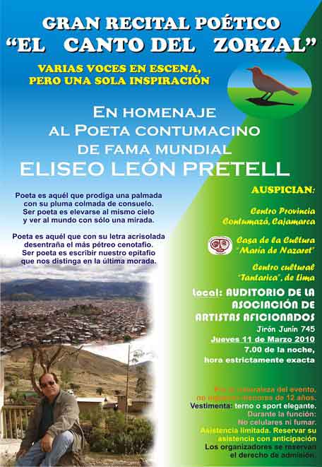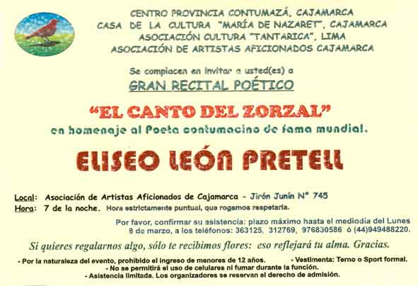 El Gran Homenaje al poeta contumacino Eliseo León Pretell se denomina: Gran Recital Poético “El Canto del Zorzal”, que se llevará a cabo el día jueves 11 de Marzo a horas 07:00 p.m. en el auditorio de la Asociación de Artistas Aficionados de Cajamarca sito en el Jr. Junín Nº 745. Le tributan el Centro Provincia Contumazá, Cajamarca, La Casa de la Cultura “María de Nazaret”, Cajamarca, La Asociación Cultura “Tantarica”, Lima y La Asociación de Artistas Aficionados, Cajamarca. Cajamarca, 03 de Marzo del 2010.