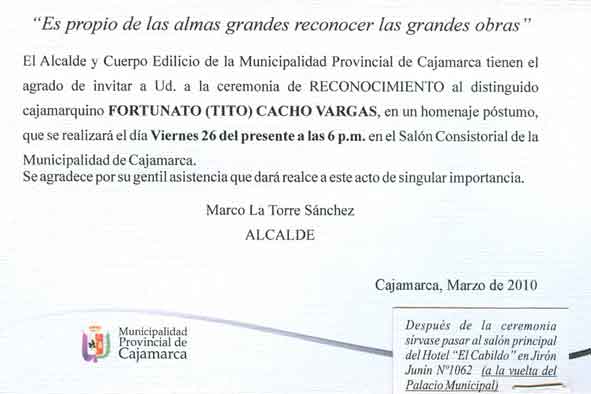 Muy exitosa fue la ceremonia de reconocimiento “Hijo predilecto de Cajamarca” al ilustre cajamarquino Fortunato Cacho Vargas (Tito Cacho) que se llevó a cabo en el Salón Consistorial de la Municipalidad Provincial de Cajamarca desde las 06:00 p.m. la asistencia, a esta trascendental ceremonia fue numerosa resaltando la presencia su esposa la Sra. Anita Grosso, su hija la Sra. Anita Cacho, familiares y un grupo de amigos de Tito Cacho que se dieron cita para testimoniar su aprecio, su recuerdo y su admiración a este insigne personaje por concretar muchos proyectos culturales para Cajamarca.