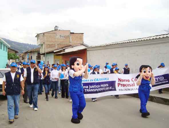 Ayer por la mañana el Ministerio Público de Cajamarca realizó un pasacalle informativo, por la principales calles de la ciudad de Cajamarca, para dar a conocer los alcances e implicancias del Nuevo Código Procesal Penal, que entrará en vigencia en nuestro Distrito Judicial el 01 de abril del presente año, acompañaron en esta actividad informativa algunas instituciones comprometidas con el éxito de este dispositivo legal. Esperamos que con nuevas leyes se agilicen los procesos judiciales y tengamos resultados más justos, más trasparentes y sobretodo más ágiles.