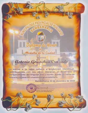 En el último acto público del Concejo Provincial de Hualgayoc, el Alcalde señor Esteban Campos Benavides, el día 22 de presente, mediante Resolución Municipal Nº 0121-A-MPH-BCA de fecha 20 de diciembre del 2010 otorga DIPLOMA de HONOR AL MÉRITO Y MEDALLA DE LA CIUDAD al poeta Antonio Goicochea Cruzado.