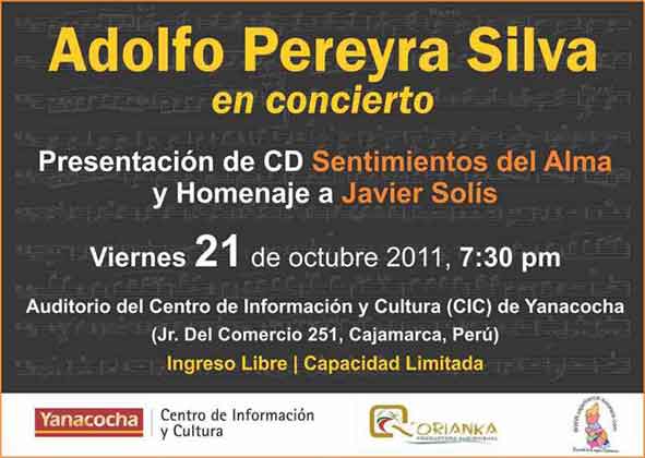 Mañana viernes 21 de octubre Adolfo Pereira Silva presentará su CD Sentimiento del alma y rendirá un homenaje al recordado e inmortal Javier Solis, desde las 07 y 30 de la noche, en el Auditorio del CIC de Yanacocha sito en el Jr. Del Comercio Nº 251 de la ciudad de Cajamarca, Perú.