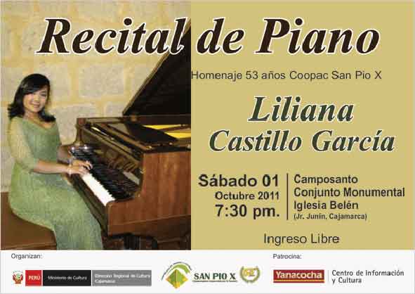 Como homenaje a la Cooperativa de Ahorro y Crédito “San Pio X” de Cajamarca en su 53º Aniversario de fundación la consagrada pianista cajamarquina Liliana Castillo García estará presentando un “Recital de Piano” en el Camposanto del Conjunto Monumental de Belén el día sábado 01 de Octubre desde las 07:30 p.m. con ingreso libre.