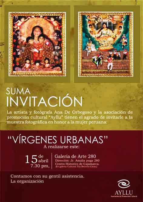 LA ARTISTA Y FOTÓGRAFA ANA DE ORBEGOSO Y LA ASOCIACIÓN DE PROMOCIÓN CULTURAL “AYLLU” TIENEN EL AGRADO DE INVITARLE A LA MUESTRA FOTOGRÁFICA EN HONOR A LA MUJER PERUANA: “VÍRGENES URBANAS” A REALIZARSE ESTE 15 DE ABRIL A LAS 7.30 PM, EN LA GALERÍA DE ARTE 280 - EX GALERÍA CULTURAL TILA BECERRA CIEZA. DIRECCIÓN: Jr. AMALÍA PUGA 280 CENTRO HISTÓRICO DE CAJAMARCA. CONTAMOS CON SU GENTIL ASISTENCIA. LA ORGANIZACIÓN
