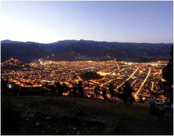 Una vista de Cajamarca cuando empieza a entrar la noche y las luces dominan el espacio. |