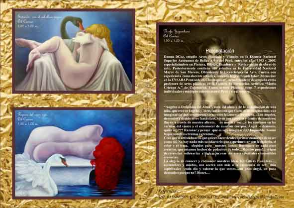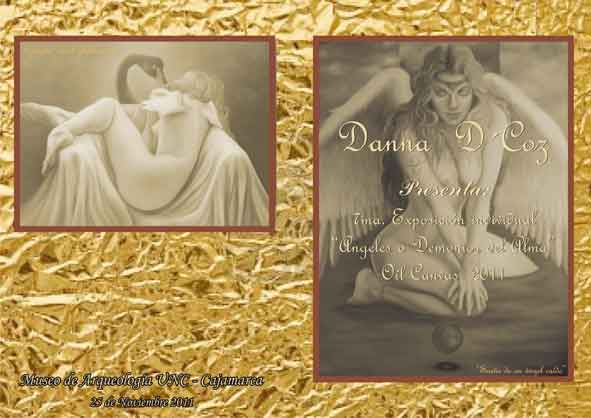 Danna D'coz, artista Visual y Profesora en la Escuela de Formación Artística “Mario Uteaga” de Cajamarca , realizará su 7ma Exposición Individual "Ángeles o Demonios del Alma", cuya ceremonia inaugural será el 25 de Noviembre del presente, en el Museo de Arqueología de la Universidad Nacional de Cajamarca, a las 07:00 p.m. a la cual se complace en invitar muy gentilmente.