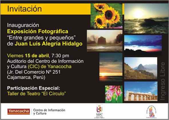 El día viernes 15 de abril se llevará a cabo la Ceremonia Inaugural de la Exposición Fotográfica “Entre grandes y pequeños” de Juan Luis Alegría Hidalgo desde las 7.30 p.m. en el Auditorio del Centro de Información y Cultura (CIC) de Yanacocha Jr. Del Comercio 251 – Cajamarca, Perú. Con la participación especial del Grupo de Teatro “El Círculo”.