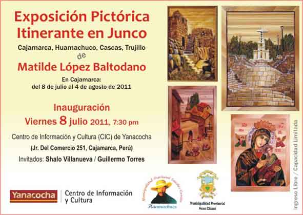 El día viernes 08 de julio, se llevará a cabo la ceremonia inaugural de la Exposición Pictórica Itinerante en Junco que presenta la artista Matilde López Baltodano que tendrá lugar en el Auditorio del Centro de Información y Cultura del (CIC) de Yanacocha desde las 07:30 de la noche.