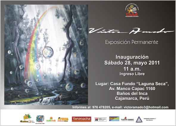 El pintor nacional Víctor Amado Portal Villena inaugura el día de mañana sábado 28 de mayo su Exposición Pictórica Permanente “Víctor Amado” en instalaciones especiales de la Casa – fundo “Laguna Seca” de Baños del Inca, Cajamarca, Perú, sito en la en la Av. Manco Cápac Nº 1160, el ingreso es Libre y la ceremonia inaugural está programada desde las 11:00 a.m.
