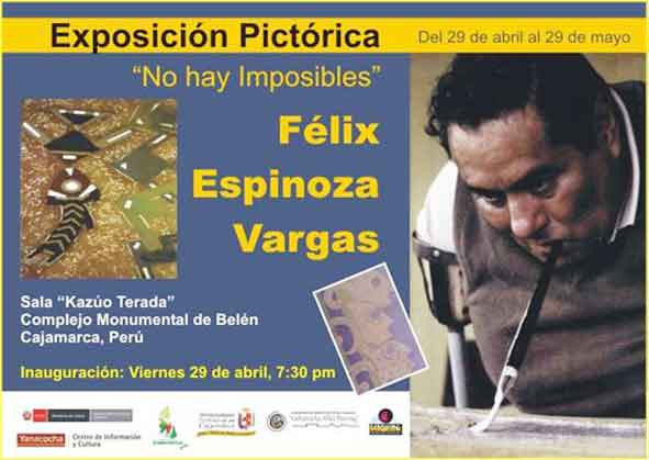 El pintor nacional Félix Espinoza Vargas presentará su muestra pictórica “No hay imposibles” en la Sala “Kasúo Terada” del Complejo Monumental Belén de Cajamarca, Perú el día viernes 29 de Abril desde las 07:30 p.m.