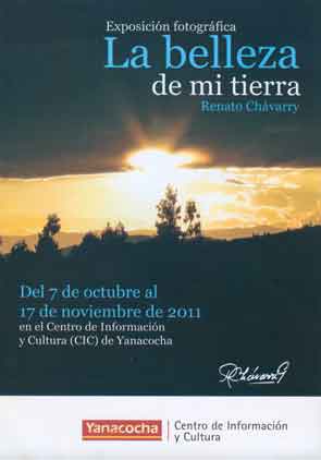 Desde el viernes 07 de octubre hasta el 17 de noviembre del año en curso se está presentando la Exposición fotográfica “La belleza de mi tierra” del reconocido fotógrafo cajamarquino Ing. Renato Chávarry Gionti en las instalaciones del Centro de Información y Cultura del (CIC) de Yanacocha sito en el Jirón del Comercio Nº 251 de la ciudad de Cajamarca, Perú.