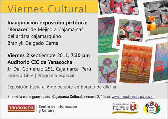 Viernes Cultural, el día de hoy 02 de setiembre se llevará a cabo la ceremonia inaugural de la exposición pictórica “Renacer, de México a Cajamarca” del artista cajamarquino Branlyk Delgado Cerna en el Auditorio del Centro de Información y Cultura (CIC) de Yanacocha desde las 07:30 p.m. con ingreso libre y se estará presentando un Programa Especial.