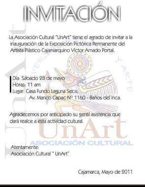 La Asociación Cultural Cajamarquina “UnArt” invita a la ceremonia inaugural de la Exposición Pictórica Permanente del artista plástico y pintor nacional Víctor Amado Portal Villena.