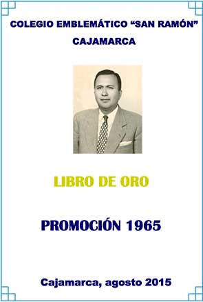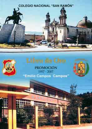 toria de «San Ramón» y de sus ex alumnos, están plasmados en importantes publicaciones, cuyo contenido no hace sino ratificar la esforzad a labor académica que se cumple en nuestro inolvidable claustro. La presente edición, por razones estrictamente económicas, no refleja toda la majestad de nuestro Colegio. Limitaciones presupuestales impiden una edición que realmente esté a la altura de «San Ramón», sin embargo, haciendo denodados esfuerzos, y conscientes de que es deber de todo samamonino rendir homenaje a su alma mater, es que dejamos en manos de la colectividad cajamarquina la presente publicación, cuyas páginas reflejan la añoranza y el testimonio de nuestro recuerdo y profunda gratitud. Desde estas líneas, la Promoción 1957 «Emilio Campos Campos», convoca a alumnos y ex alumnos a tomar conciencia del alto deber y compromiso que nos toca, a fin de retomar, con mucha responsabilidad, acciones orientadas a mantener e incrementar la imagen del Colegio, reconocida fuente del saber, de donde seguirán saliendo hombres que cultiven la justicia y la verdad, que velen por una sociedad en la cual se respeten los derechos humanos y donde efectivamente se cultiven los valores. Segundo Rojas Fernández. N. R. Agradecemos profundamente al Prof. Antonio Castro Murga, integrante de la Promoción 1957 - 2007 "Emilio Campos Campos" por obsequiarnos un ejemplar de su "Libro de Oro". |