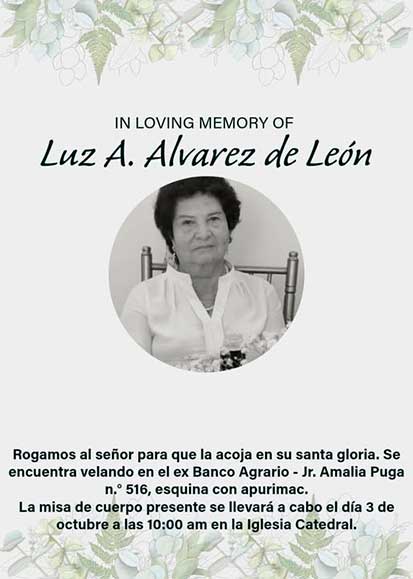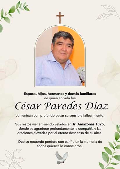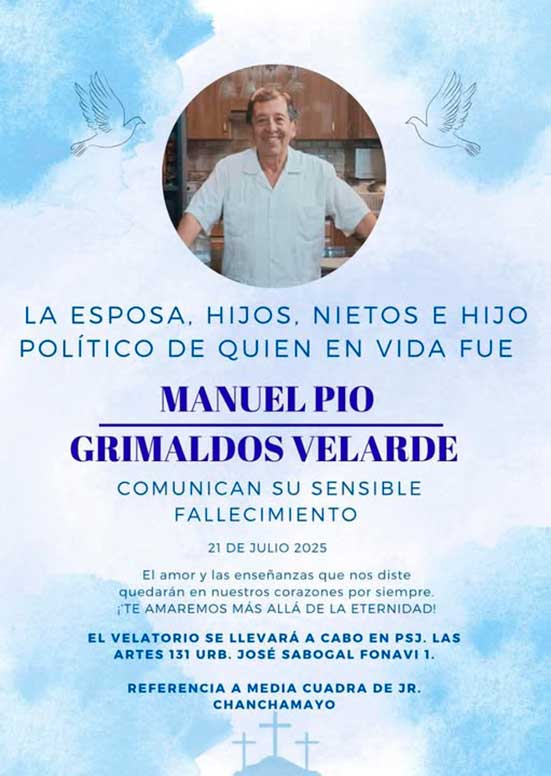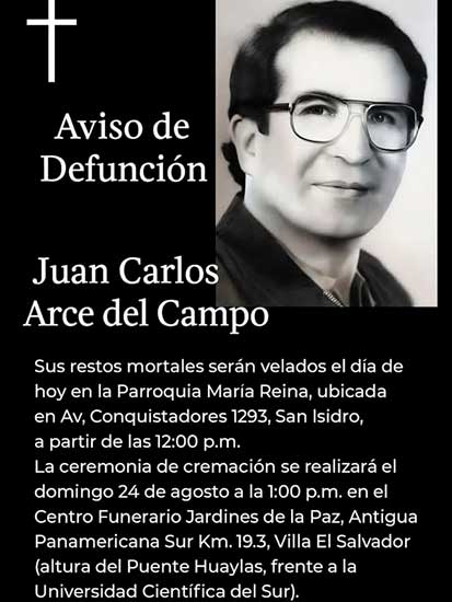 El velatorio se realizará en su domicilio Jr. Los Cerezos 191 de