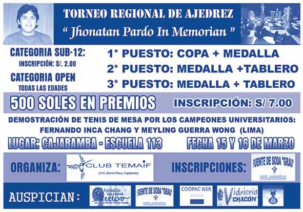 Los días 15 y 16 de marzo se estará desarrollando el Torneo Regional de Ajedrez Jhonatan Pardo como homenaje póstumo a este joven deportista cajabambino en los ambientes de la Institución Educativa 113 –Escuela 113.