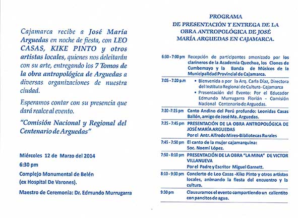 El día de mañana miércoles 12 de marzo, desde las 6:30 de la tarde, en Ex - Hospital de Varones del Complejo Monumental de Belén se estará presentando la obra antropológica completa del connotado escritor peruano el ‘Gran Amauta’ José María Arguedas, por lo que los organizadores cursan la siguiente invitación y el correspondiente Programa: