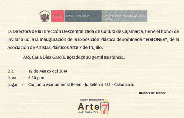 El día sábado 15 de marzo se lleva a cabo la Inauguración de la Exposición Plástica denominada Visiones, de la Asociación de Artistas Plásticos Arte 7 de Trujillo, por lo que los organizadores cursan la siguiente invitación al pueblo cajamarquino: