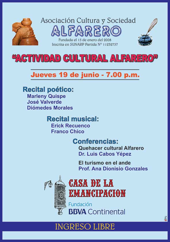 El Gerente Territorial Norte del BBVA Continental y el Presidente de la Asociación Cultura y Sociedad "Alfarero" invitan a Usted y Familia a la ACTIVIDAD CULTURAL "ALFARERO", que se realizará: