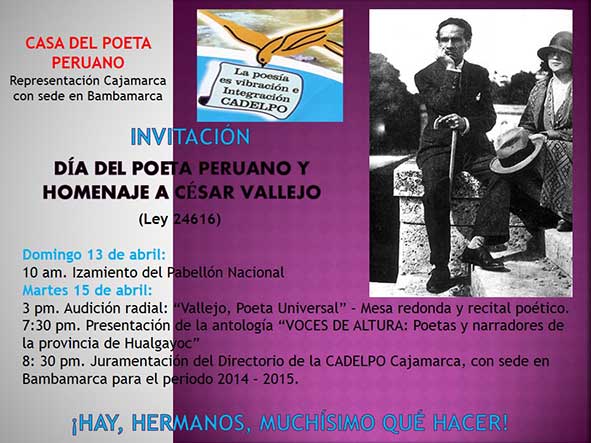 La Casa del poeta Peruano filial en Bambamarca desarrolla una destacada y activa presencia cultural en la Región Cajamarca, ayer, en la sección de Homenajes a César Vallejo publicamos el correspondiente programa con el cual celebran el Día del poeta Peruano y Homenaje a César Vallejo, ahora, nos complacemos en presentar la cordial invitación, un banner muy alusivo a este homenaje, agradeciendo al Lic. César Mejía por esta distinción que siempre nos depara.