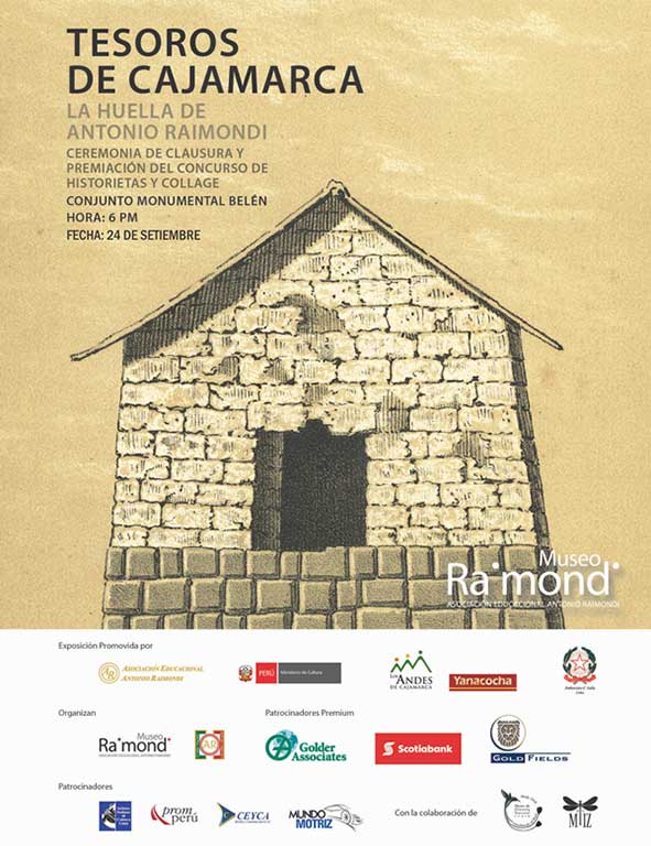 Se invita cordialmente a la colectividad cajamarquina a la ceremonia de clausura de la muestra "Tesoros de Cajamarca" la huella de Antonio Raimondi, que se desarrollará en el patio principal del Conjunto Monumental Belén, este 24 de setiembre a las 6:00 p.m.