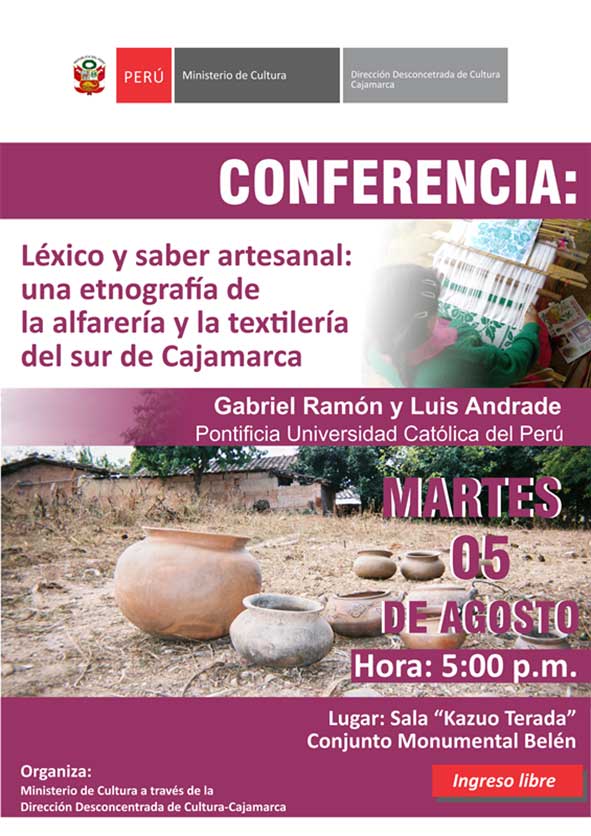 El Ministerio de Cultura a través de la Dirección Desconcentrada de Cultura – Cajamarca y la Pontificia Universidad Católica del Perú (PUCP) invitan a los sectores turístico, artesanal y público en general de nuestra ciudad, a la conferencia “Léxico y saber artesanal: una etnografía de la alfarería y textilería del sur de Cajamarca” presentado por el Lingüista, Luis Andrade y el Arqueólogo, Gabriel Ramón; Docentes de la PUCP.