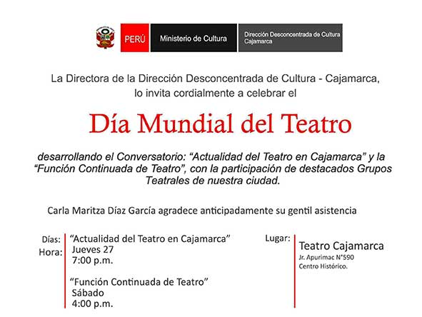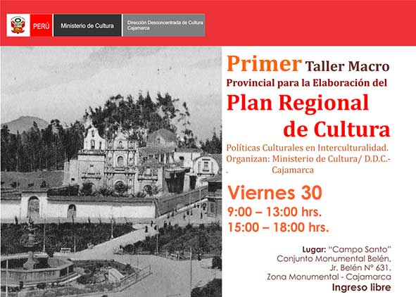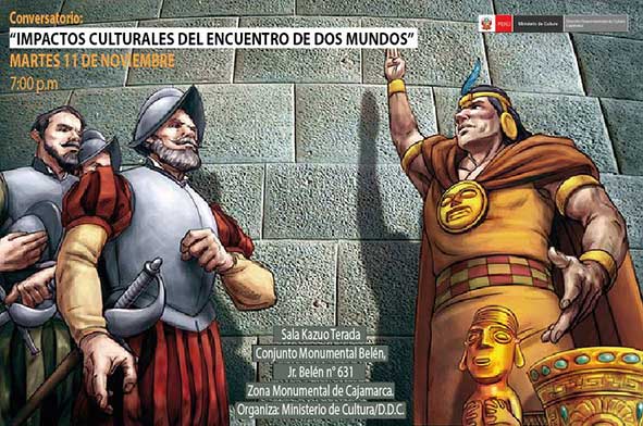 En el marco de las actividades programadas por la Semana Cultural “Encuentro de dos mundos” el Ministerio de Cultura a través de la Dirección Desconcentrada de Cultural – Cajamarca (DDC - Cajamarca), los invita a participar del conversatorio: IMPACTOS CULTURALES DEL ENCUENTRO DE DOS MUNDOS / 7:00 p.m. en la Sala “Kazuo Terada” del Conjunto Monumental Belén, Jr. Belén n°631, Zona Monumental de Cajamarca.