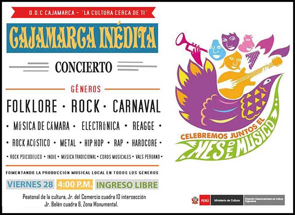 La DDC-Cajamarca, fomentando la producción musical local en todos los géneros "Cajamarca Inédita", invita muy gentilmente a la colectividad Cajamarquina al Festival musical que se desarrollará con el fin de fomentar la producción musical local en todos los géneros y reúne bandas de rock, folklore, electrónica, metal y a muchos géneros más en un solo espectáculo.