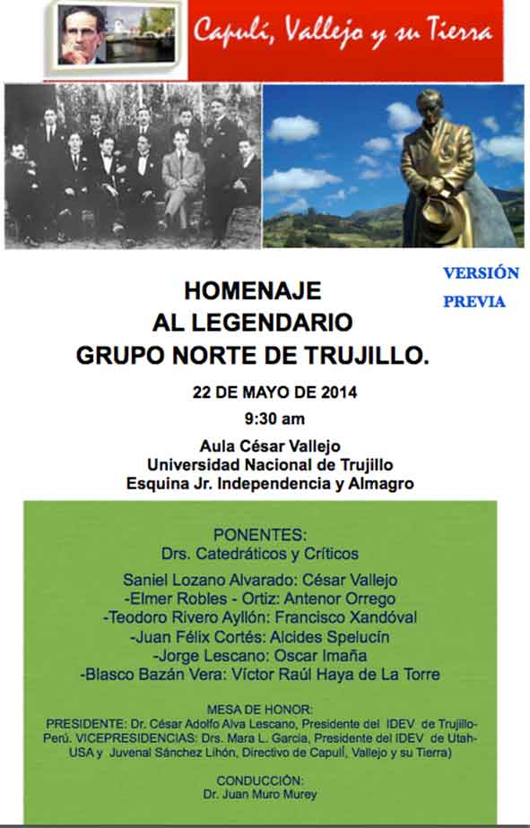 El día jueves 22 de mayo se rendirá un merecido homenaje al legendario Grupo Norte de Trujillo desde las 09:30 a.m. en el aula César Vallejo de la Universidad Nacional de Trujillo con la participación como ponentes de muchas lumbreras del ámbito literario de Trujillo.