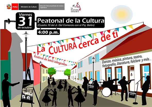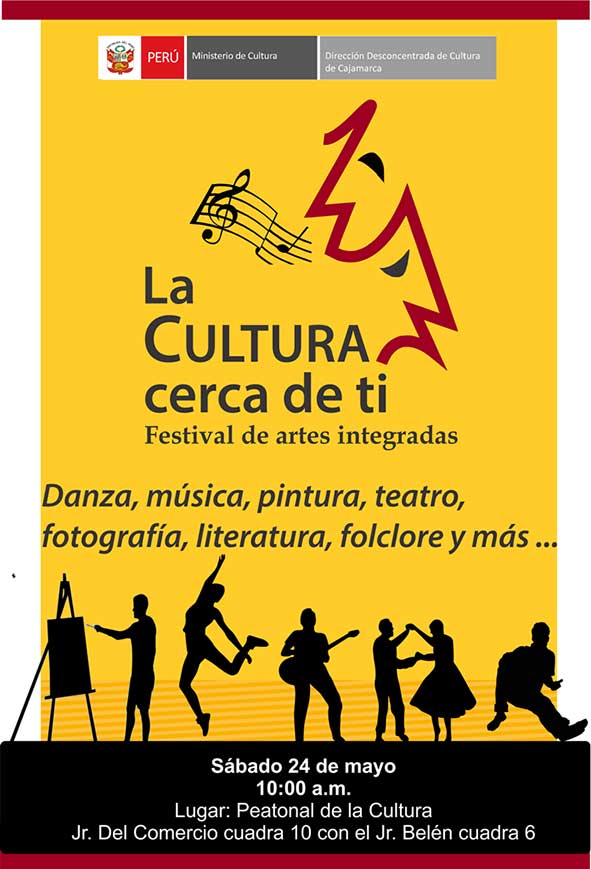 La Dirección Desconcentrada de Cultura – Cajamarca (DDC-Cajamarca) este sábado 24 de mayo en la Peatonal de la Cultura (Jr. Del Comercio cuadra 10 con el Jr. Belén cuadra 6) desarrollará su Festival de Artes Integradas “La Cultura Cerca de Ti” con la finalidad de propiciar la participación activa de la comunidad y artistas Cajamarquinos.