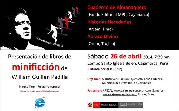 Este sábado 26 de abril se lleva a cabo la presentación de tres libros: Cuaderno de Almanaquero, Abrazo Divino e Historias Heredadas del connotado escritor cajamarquino William Guillén Padilla la cita literaria es en el Campo Santo del Conjunto Monumental de Belén de Cajamarca, Perú, -Jr. Junín s/n-, desde las 07:30 p.m. por lo que se invita a la colectividad cajamarquina y hombres y mujeres de las letras a disfrutar de esta gran velada literaria.