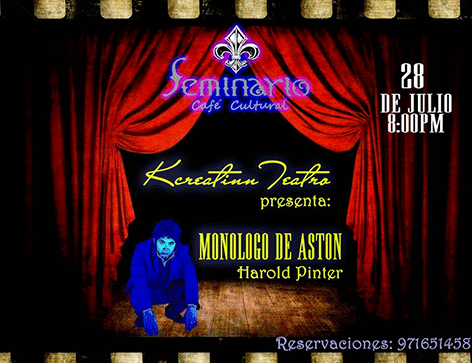 Kcreatinn Teatro presenta Monólogo de Astón. De Harold Pinter, se llevará a cabo el día 28 de julio del año en curso, en el Seminario Café sito en el Jr. Amalia Puga Nº 811 – 2do. Piso del Centro Histórico de Cajamarca, a cargo del escritor Javier Farfán.