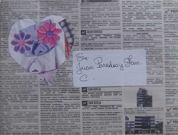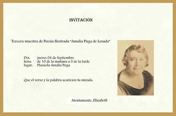 Insertamos la tarjeta de invitación con un poema de Jorge Pereyra y el correspondiente sobre para dar a conocer la originalidad en su confección de este artístico y original sobre, realizado de material reciclable –hojas de periódico- pequeños adornos y sobretodo buen gusto y creatividad de Socorrito Barrantes.