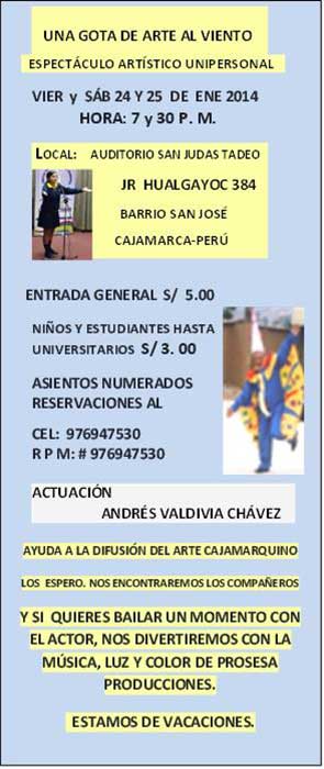 Se invita muy cordialmente a los amantes del arte a disfrutar de un espectáculo artístico cultural Una gota de arte al viento que presenta el gran artista polifacético Andrés Valdivia Chávez que se llevará a cabo el día de hoy sábado 25 de enero 2014, a horas 7 y 30 p. m., en el auditorio San Judas Tadeo de PROSESA Producciones E I R L, sito en Jr. Hualgayoc 384 (a una cuadra de la 2da Comisaría de la Policía Nacional) barrio San José.