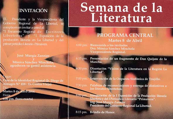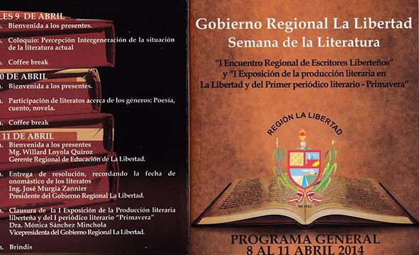 Del 08 al 11 de abril hay una fiesta literaria en la Región La Libertad, su Gobierno Regional ha organizado un homenaje, muy merecido, a los Escritores Liberteños celebrando una Semana de la Literatura en cuya ceremonia inaugural se entregarán distintivos de reconocimiento a los literatos liberteños por parte del Gobierno Regional de La Libertad, según el programa, que a continuación lo presentamos, el día 11 de abril –que es el día de la clausura del evento- también se entregarán Resoluciones recordando la fecha de onomástico de los escritores a cargo del Presidente de la Región La Libertad Ing. José Murgia Zannier.