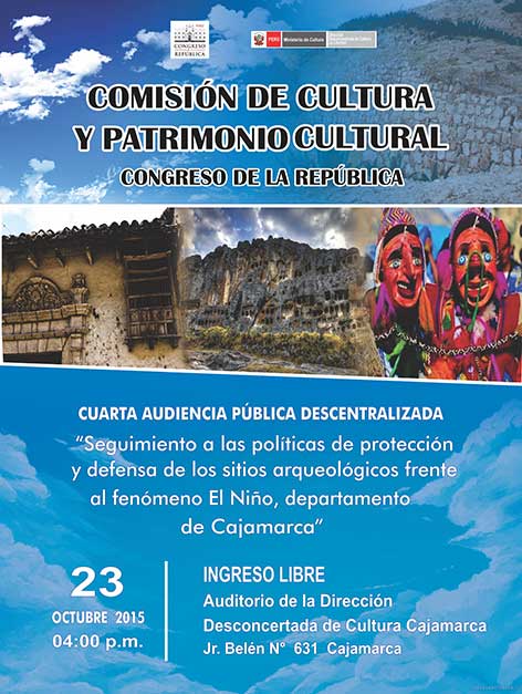 El presidente de la Comisión de Cultura y Patrimonio Cultural, Ramón Kobashigawa Kobashigawa, indicó que la cuarta audiencia pública descentralizada: “Seguimiento a las políticas de protección del patrimonio arqueológico del departamento de Cajamarca frente al fenómeno El Niño, se realizará el viernes 23 de octubre, a las 4:00 p.m., Conjunto Monumental Belén, Jr. Belén Nº 631.