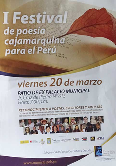 El día de mañana viernes, 20 de marzo, desde las 07:00 de la noche en el Patio Principal el Ex Palacio Municipal -sito en el Jr. Cruz de piedra No. 613 de la ciudad de Cajamarca-, se desarrollará el I Festival de Poesía Cajamarquina para el Perú, con la finalidad de ofrecer un Reconocimiento a Poetas, Escritores y Artistas cajamarquinos, que con su obra literaria y artística incrementan día tras día, año tras año en forma intensa, permanente y silenciosa el acervo cultural de la Región Cajamarca.