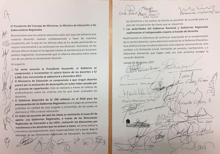 Tras reunión del premier Fernando Zavala , los gobernadores y la ministra de Educación , Marilú Martens, anunciaron esta noche que el gobierno se compromete a incrementar el salario básico de docentes a S/2,000 en diciembre del presente año.