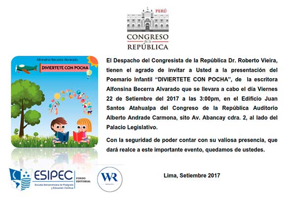 Da alegría tener que informar de los éxitos de los poetas y escritores cajamarquinos, esta vez les participamos que el día viernes 22 de setiembre se estará presentando el poemario infantil Diviértete con Pocha de la connotada escritora y poeta Alfonsina Becerra Alvarado.