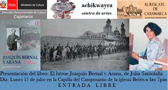 El Grupo de Estudios y Promoción Cultural “Al Rescate de Caxamarca”, el Centro de Artes Achikwayra y la Dirección Desconcentrada de Cultura de Cajamarca presentarán este lunes 17 de julio el libro “EL HÉROE JOAQUÍN BERNAL Y ARANA. SU LEGADO Y SU TRASCENDENCIA”, recientemente publicado en Lima, de la investigadora Julia Santolalla Fernández.