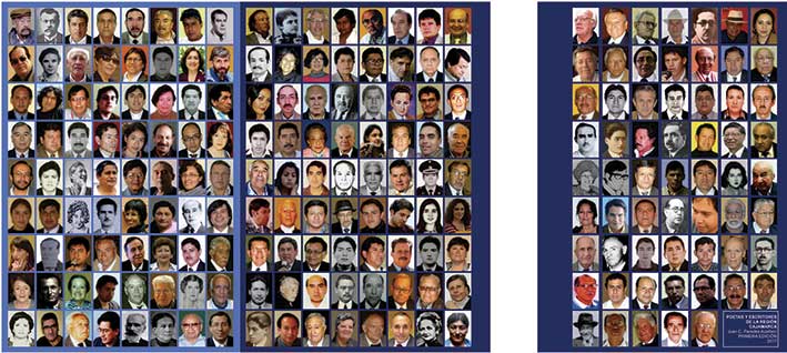 La carátula es una verdadera obra de arte elaborada por el artista polifacético Guillermo Bazán Becerra quien ha puesto lo mejor de su destreza elaborando un trifolio impreso por ambos lados con 415 fotografías de poetas y escritores de la Región Cajamarca, cada fotografía ha sido editada por separado con color, textura, resolución y tamaño para formar entre todas una unidad homogénea y elegante.