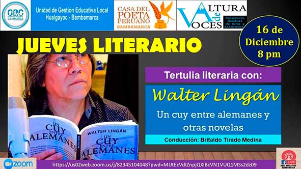 Será un conversatorio inolvidable. Adjuntamos flayer y pronto les estaremos alcanzando el link que generosamente nos cede el escritor Walter Lingán, a quien desde ya nuestra gratitud.