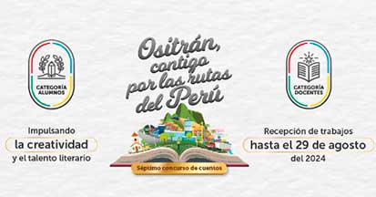 OSITRÁN, CONTIGO POR LAS RUTAS DEL PERÚ Juan C. Paredes Azañero. Ositrán lanza este año 2024 la 7ª Edición del concurso nacional de cuentos “Ositrán, contigo por las rutas del Perú” con la finalidad de dar a conocer a la comunidad escolar la importancia de las infraestructuras de transporte de uso público concesionada en el desarrollo social y económico de las poblaciones del país. Podrán participar los escolares del tercer y cuarto grado de secundaria y docentes de inicial, primaria y secundaria de instituciones educativas públicas y privadas de educación básica regular a nivel nacional, diferenciados en dos categorías: · Categoría Alumnos: Dirigido a estudiantes de 3.er y 4.to grado de secundaria. · Categoría Docentes: Dirigido a profesores de inicial, primaria o secundaria, independientemente de su régimen laboral. Para participar envíe su ficha y su trabajo al correo: Concurso_cuentos@ositran.gob.pe con el asunto: Concurso de cuentos Ositrán 2024, desde el 9 mayo hasta el 29 de agosto de 2024. Las Bases de este concurso y las fichas correspondientes las puede descargar haciendo clic en los siguientes enlaces: Bases del Concurso Ficha Categoría Alumnos Ficha Categoría docentes Cajamarca, 21 de abril 2024.