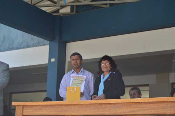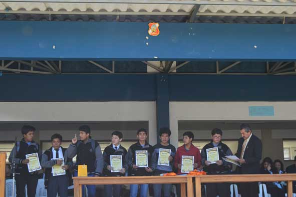 Por razones del excesivo sol que se recibía a esta hora y para proteger la salud de los alumnos se hizo entrega de premios a los alumnos que se destacaron en el presente año n deportes, arte, concursos de matemática, poesía y Líderes del Saber.