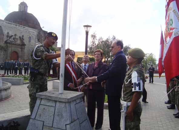 La ceremonia se inició con el izamiento de la Bandera del Perú a cardo del Gobernador de la provincia de Cajamarca Sr. Manuel Bacón Tanta acompañado de la Sra. Atala Sarmiento Casanova biznieta de don Toribio Casanova y el Dr. Francisco Espinoza Orrego biznieto de don Pedro José Villanueva.