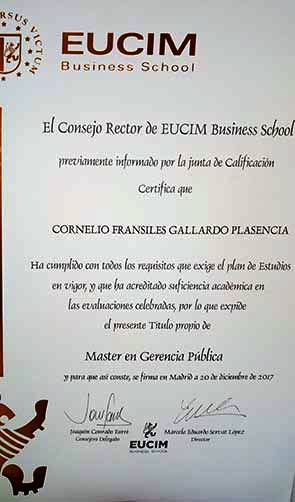 Mis sinceras felicitaciones al Ing. Cornelio Fransiles Gallardo Plasencia por la obtención el grado de Magister en Gerencia Pública obtenido en Madrid, España.