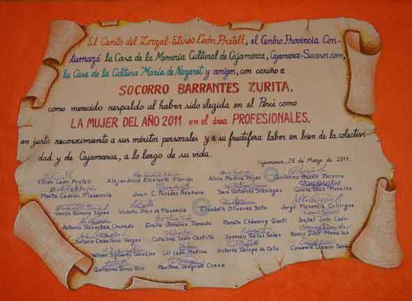la poeta cajamarquina Socorro Isabel Barrantes Zurita fue condecorada por